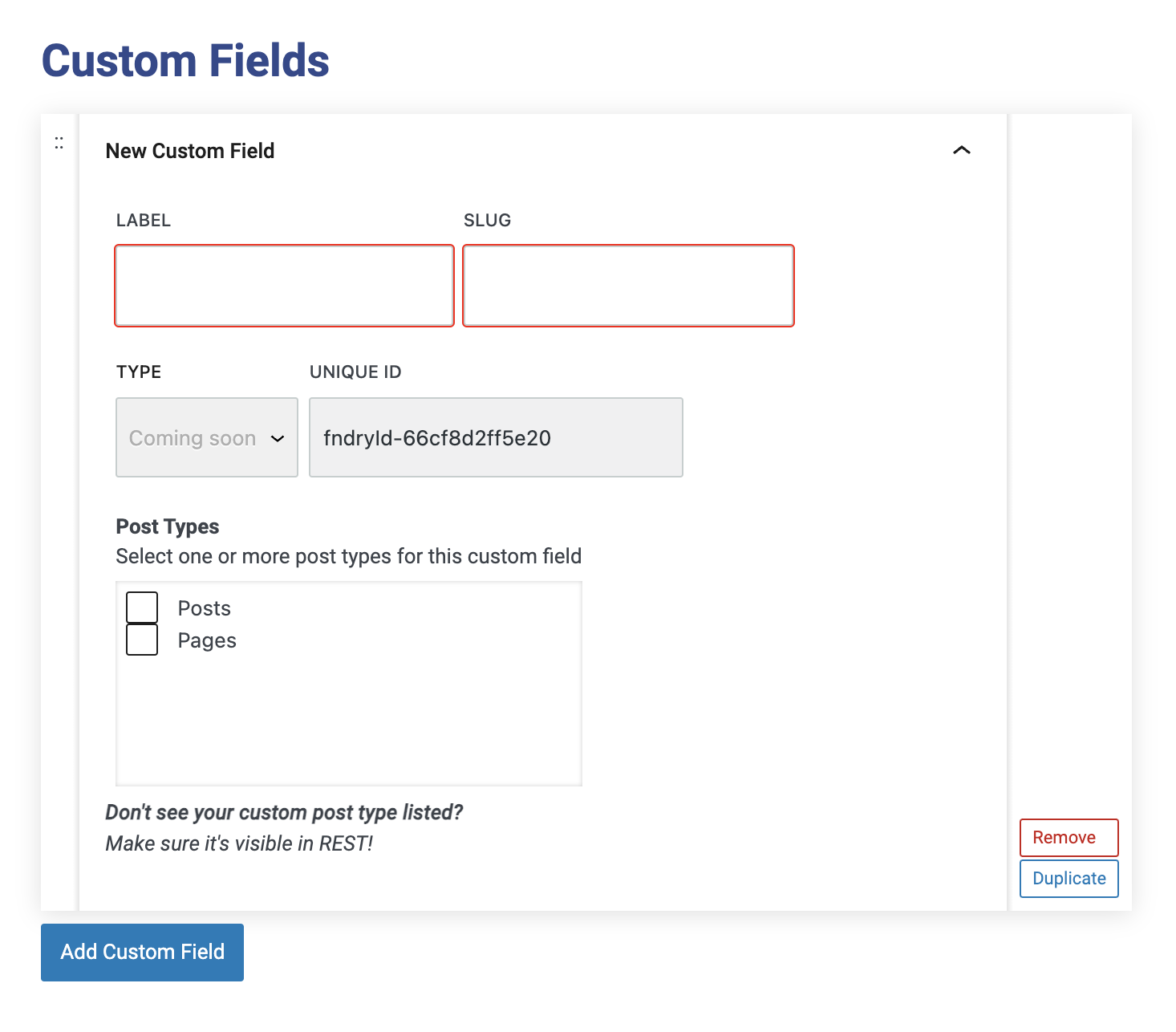Setting up Custom Fields begins in Refoundry > Custom Fields, where you actually configure the Custom Field. This configuration defines the type of data the field will hold, such as text, images, or links.