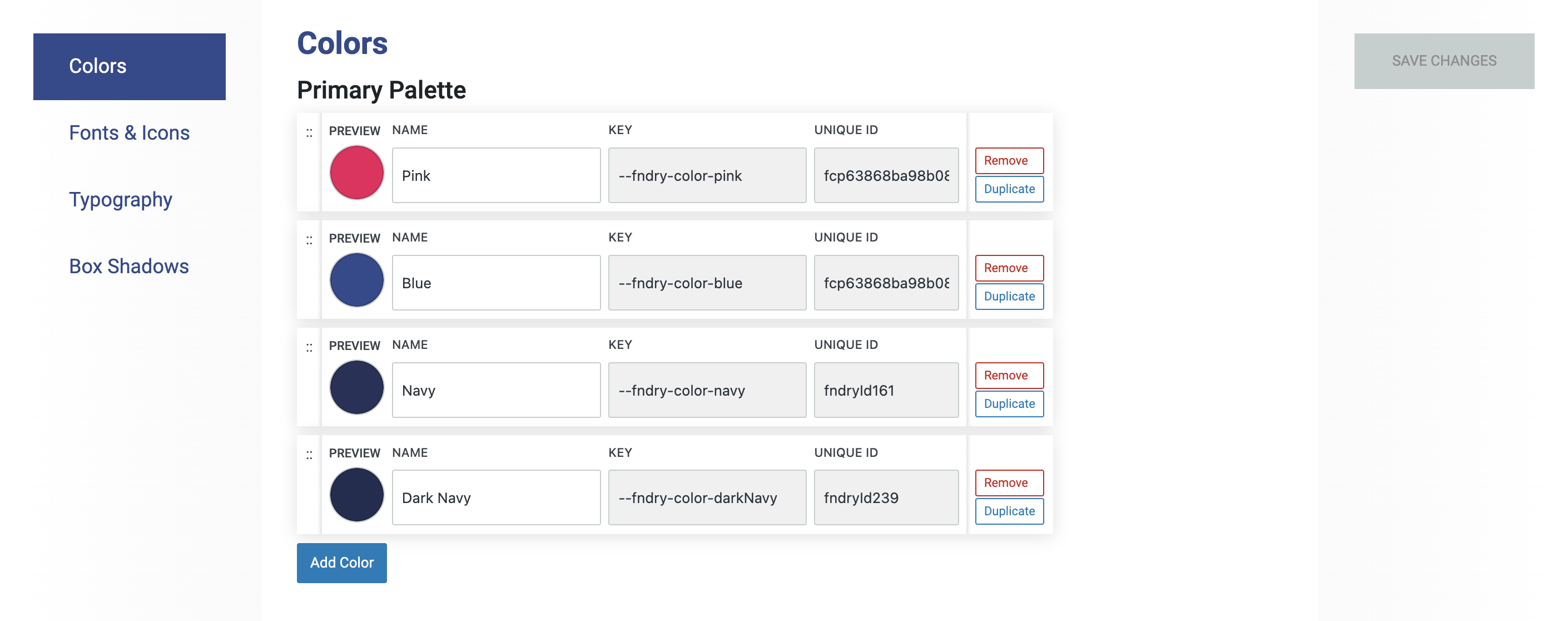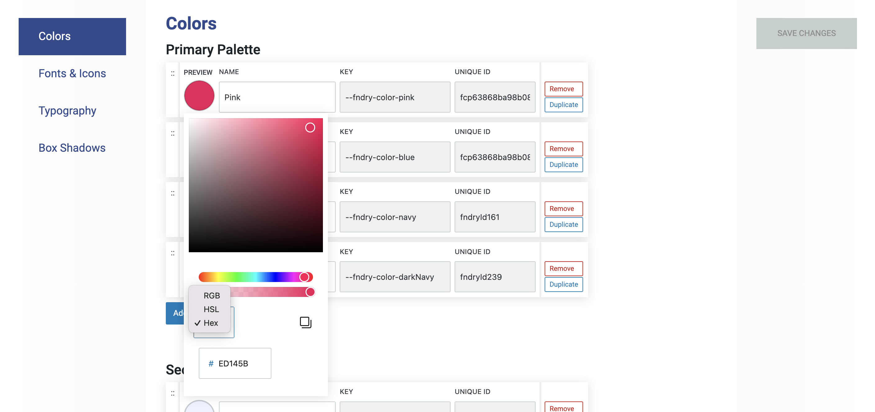 The Colors section in Refoundry is where you define and organize the color options for your website’s design. These colors are categorized into Primary, Secondary, and Neutral sections.
