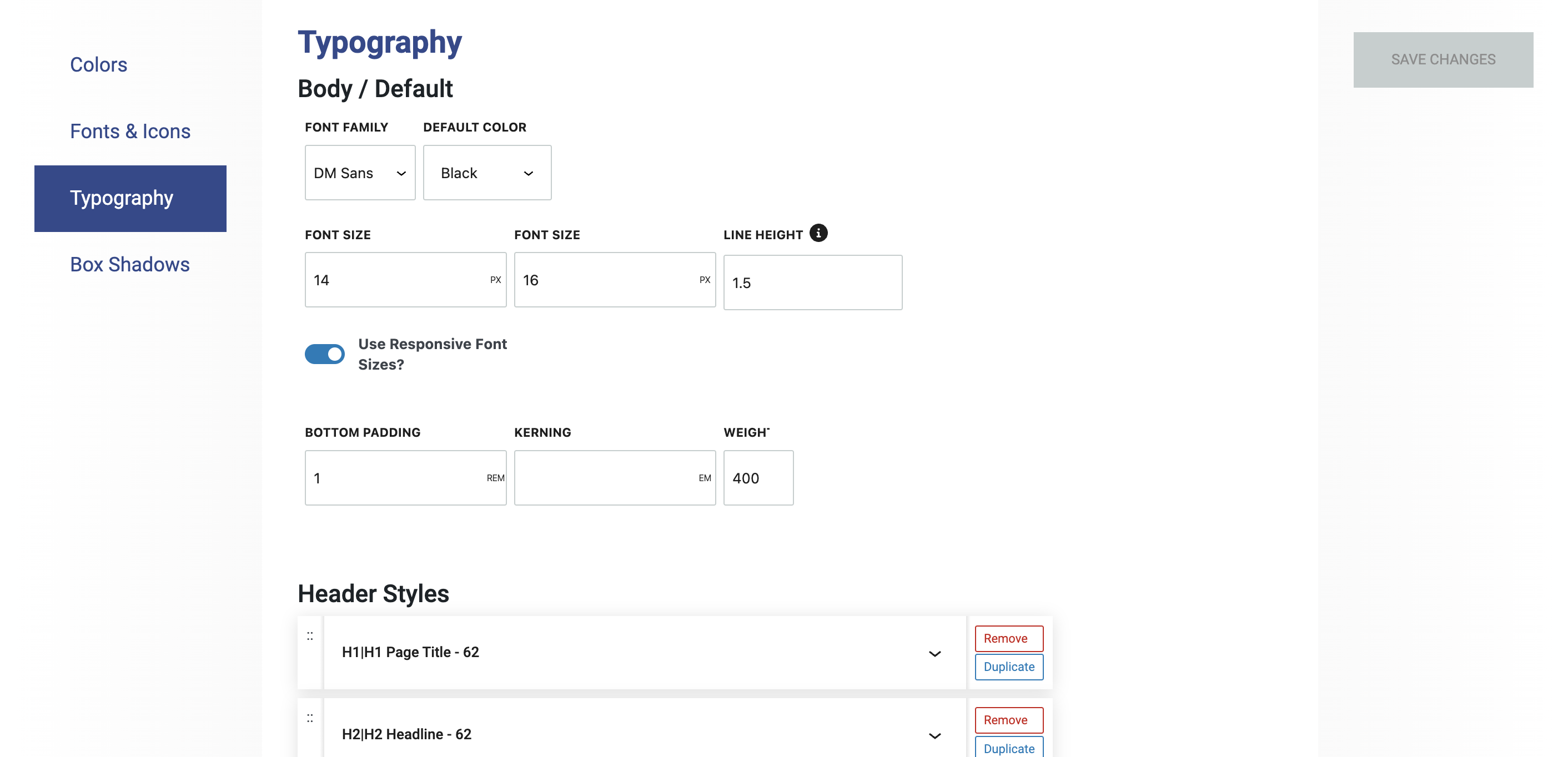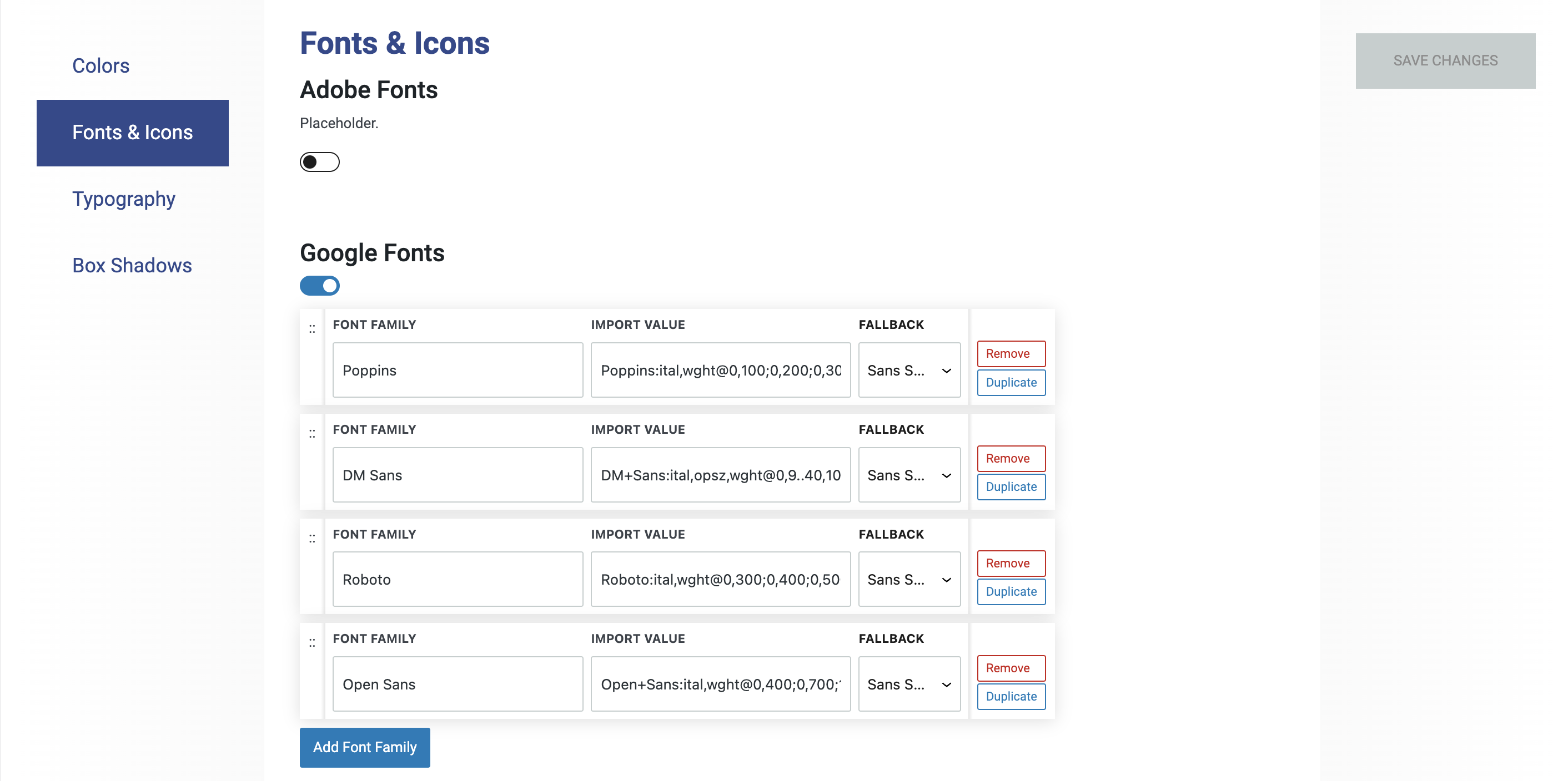 This setting allows you to set default fonts for your website, using Adobe and Google Fonts.