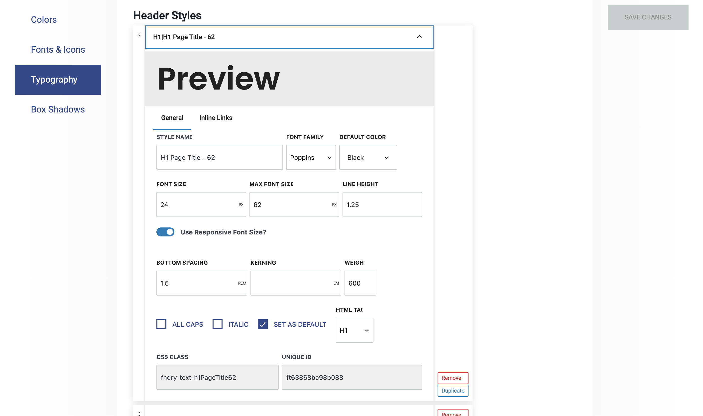 The Typography Settings in Refoundry allow you to configure all your heading and type styles, which populate the drop-downs menus for each block’s typography style settings. This is where you set the default styles for headings (H1 to H6) and paragraph (P) text, ensuring a consistent and cohesive look throughout your website.