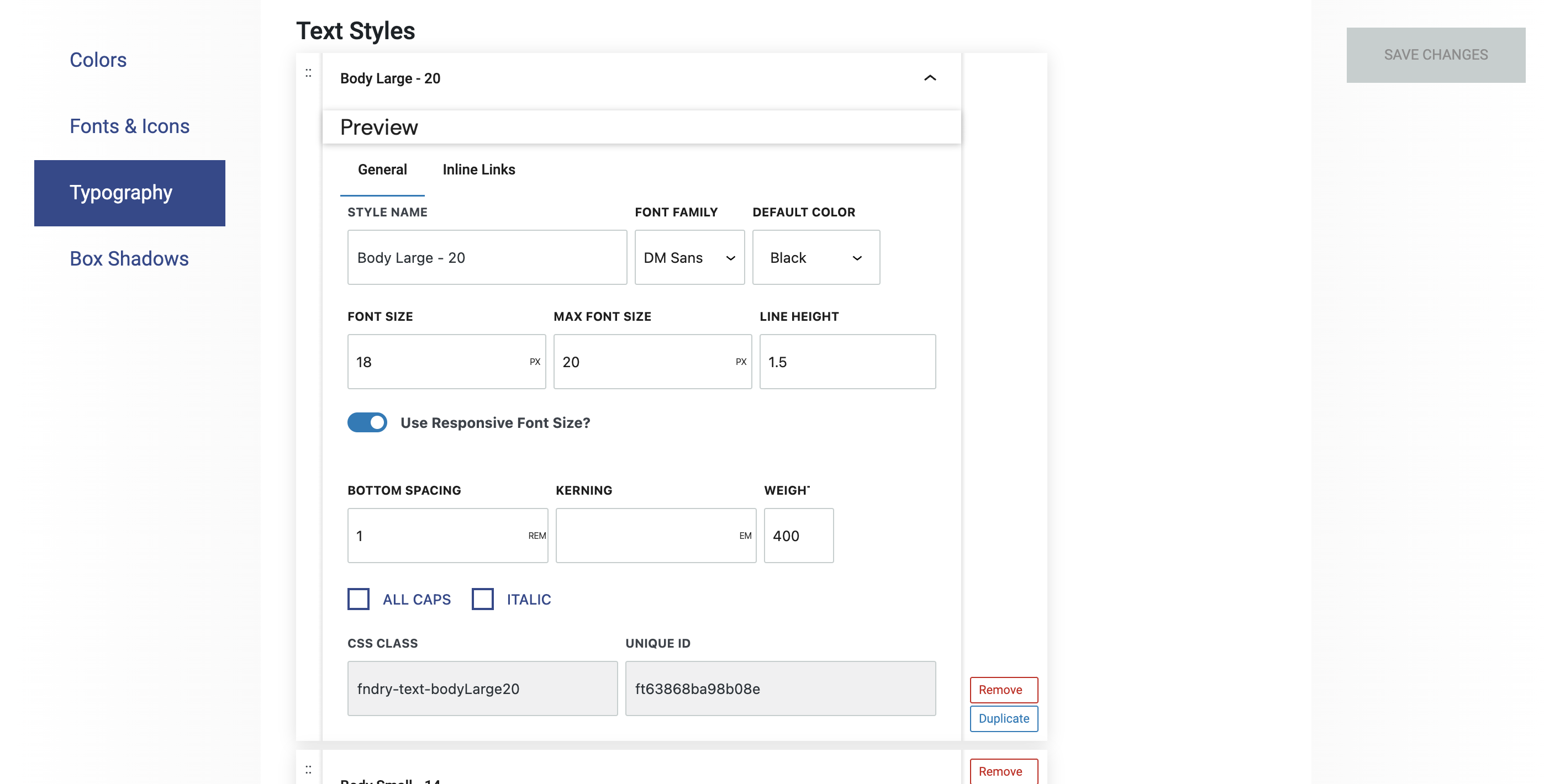 Each color requires a color code and custom name, which appears in drop-downs menus for each block’s style settings. The order of colors in these sections can be rearranged, reflecting how they appear in drop-down menus throughout block settings. This ensures your color palette is both organized and easy to manage.