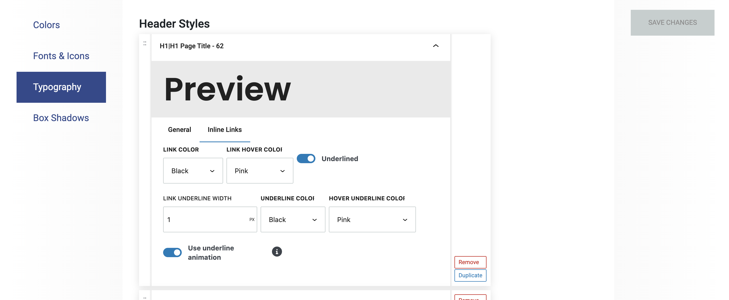 This is where you set the link colors and hover animations for linked text that is entered in Heading or Paragraph Blocks.