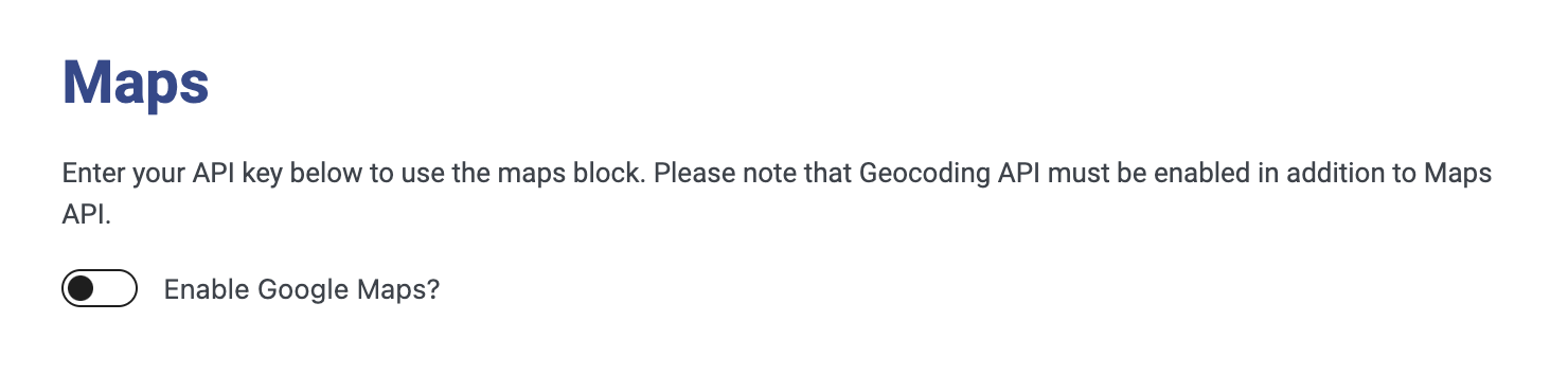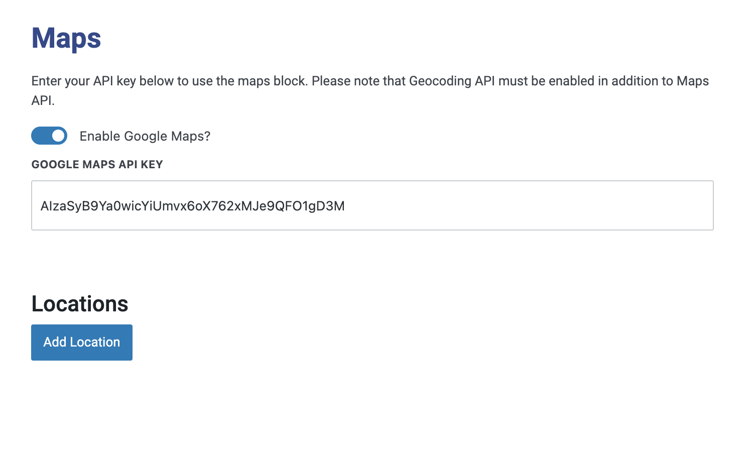 Toggling this on reveals the Google Maps API Key field and activates this functionality.