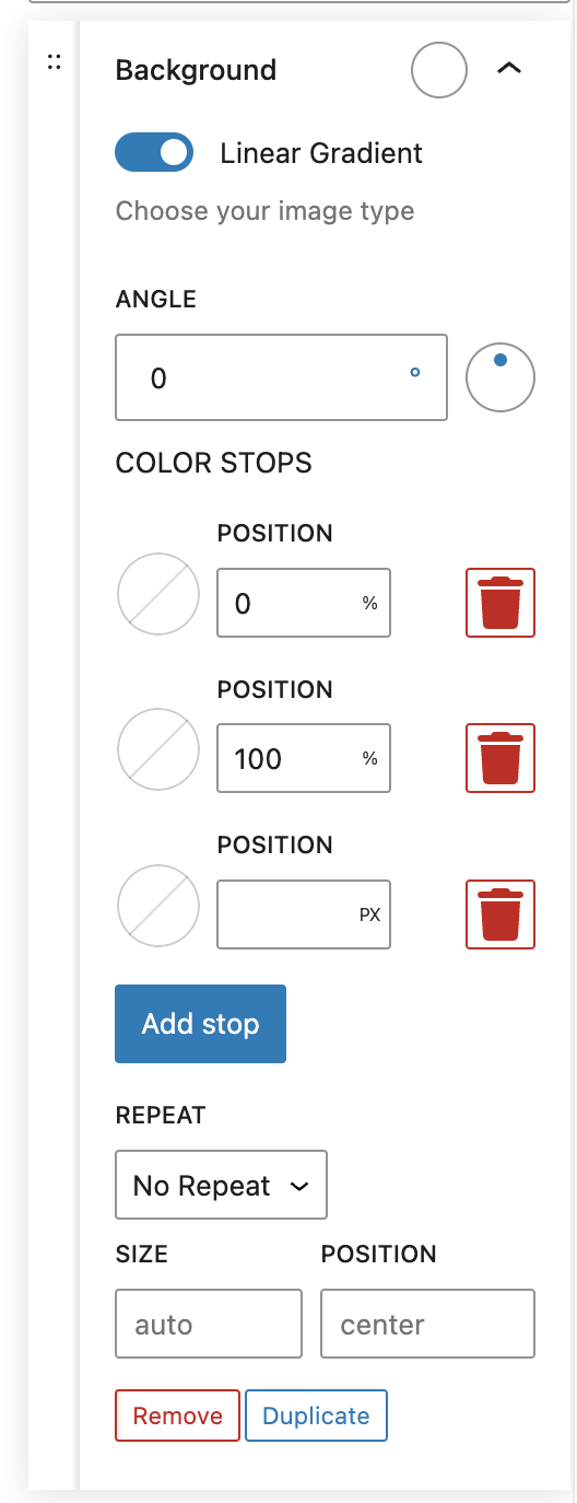 Repeat: This field determines whether the gradient should repeat itself. When enabled, the gradient will continue to repeat along the element’s background.