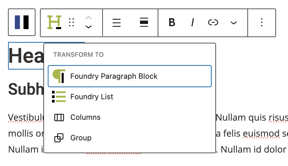 The Transform option in the Toolbar menu allows you to change one block type into another without losing content. In Refoundry, when you select a block, the transform icon (represented in the Toolbar by the selected block’s icon) appears in the block’s toolbar. Clicking this icon opens a dropdown menu with alternative block types that are compatible with the current block’s content.