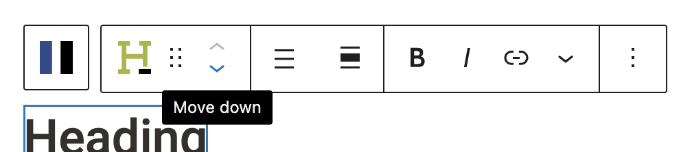 Block Navigation and Transformation: The toolbar also includes controls for moving blocks up or down within the content. Additionally, you can transform one block into another type (e.g., converting a paragraph to a heading) without needing to insert a new block, copy content over, and delete the old one. This gives you flexibility during content creation. You can also use the Toolbar to quickly move blocks up or down within the page layout.