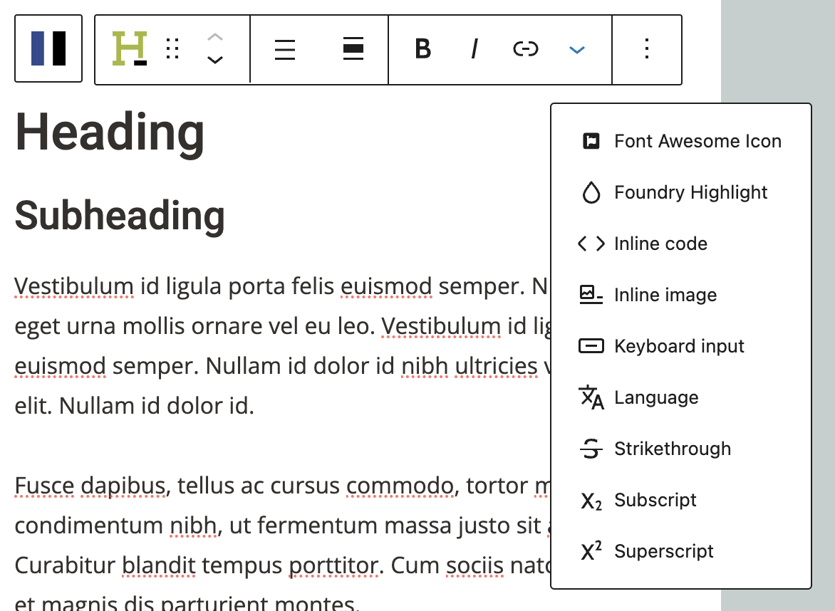 The More Menu in the Toolbar contains additional text formatting options for blocks that support text editing, such as Paragraphs, Headings, or Lists. In Refoundry, this menu includes basic formatting tools as well as some custom options specific to the Refoundry editor.