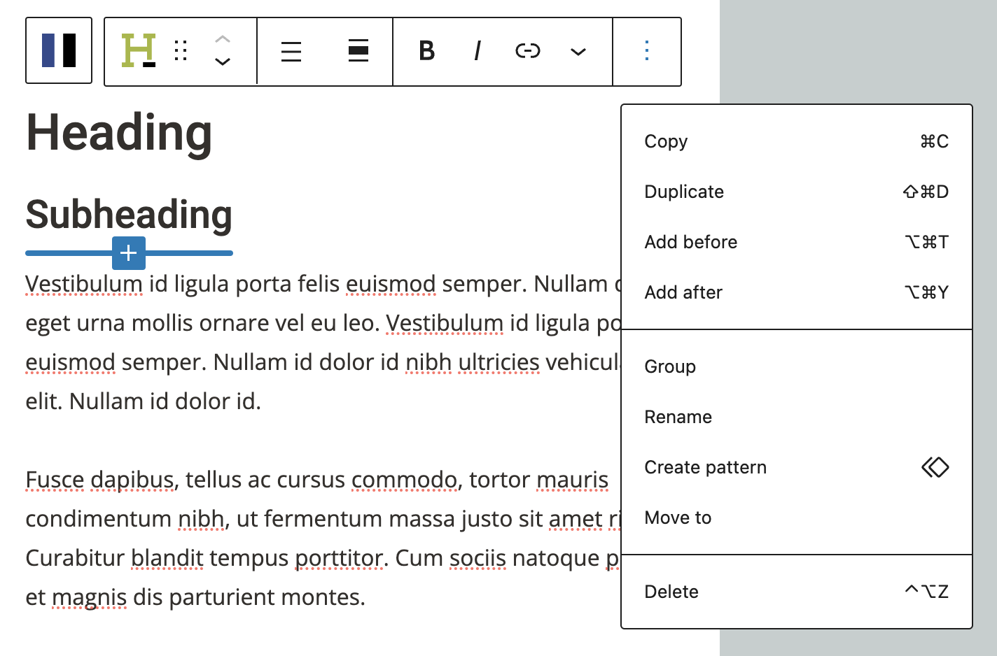 Insert Before/Insert After: Allows you to insert a new block either before or after the selected block. Handy for pasting blocks in a specific place in the document flow, after you’ve copied them to the clipboard.