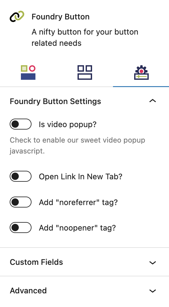 This is where you can choose to override the default button components with values entered into a post’s Custom Fields – meaning they are configured in Refoundry > Custom Fields. You create the Custom Field, and configure which post type it applies to. Then, anywhere that post type appears in Query Block on the site, the Custom Fields will appear as options. Values entered into those fields can be selected to be displayed here instead.