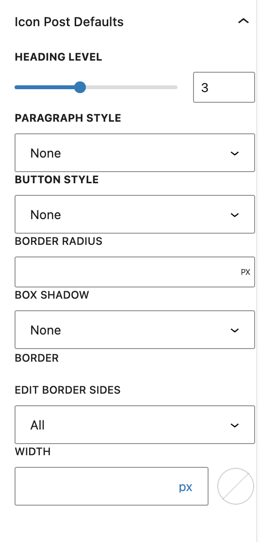 This setting allows you to choose an override for the default style the headings for all items in the Grid Block, based on the heading level set below in the Layout Tab and using your heading styles set in Global Styles > Typography. Selecting None means headings will display the default style for that heading level, ie. H1-H6.