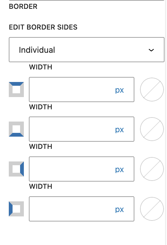 You can create equal specifications for all of your Grid Block item borders by choosing “All,” or customize each border’s specifications by choosing “Individual.” The options are Width and Border Color. The color options come from your settings found under Global Styles > Colors.