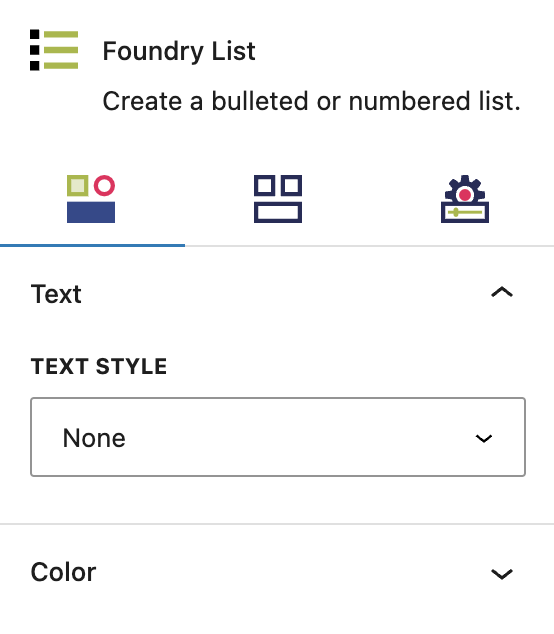 This setting allows you to change the default color of the list item text to any other color from your palette(s) set in Global Styles > Colors.