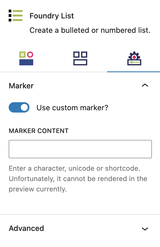 This is a toggle that allows you to set a custom marker for all list items, instead of the default bullet points and numbers. This will enable Marker Icon settings for each List Item as well as setting a default icon for each list item.