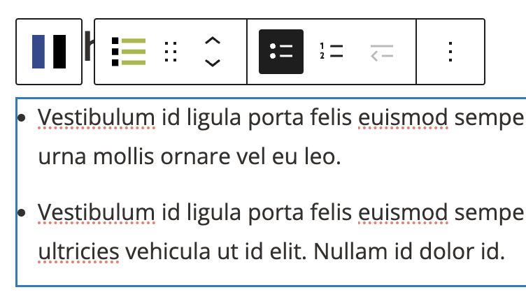 The List Block is also a parent block. When you add your first point on the list, it automatically adds a List Item for that and each following point. The List Item Block controls each individual list item. If you have a List Block with 10 items, you will have 10 List Item blocks. The text styles for list items will default to the body text style set in Global Styles > Typography.