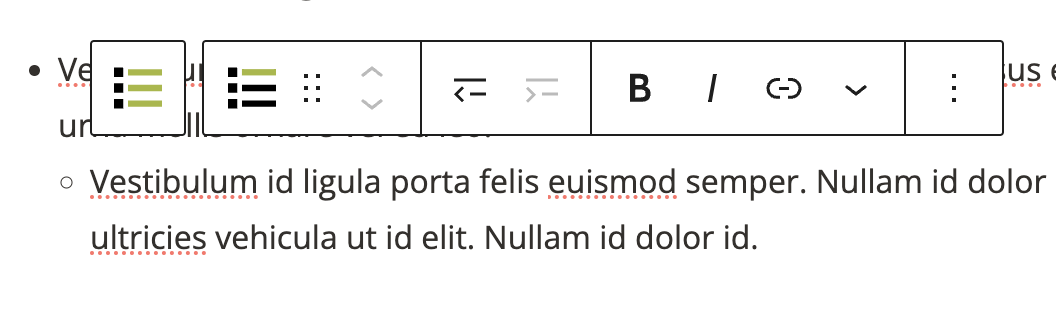 Use the left or right indent tool to determine if a list item nests with the parent item, or sits as its own item. This way you can have one or more indented list items within a larger list, to show sub-topics or points in a visually distinct way.