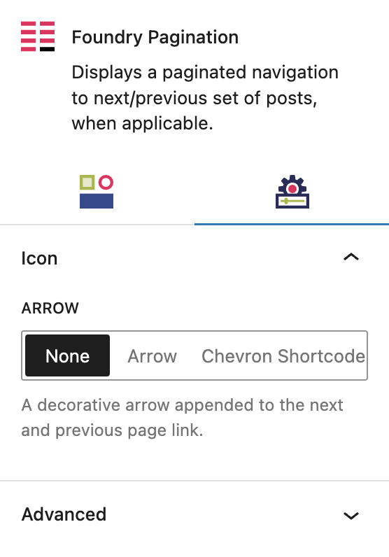 If you choose Arrow or Chevron, you’ll see the symbol in the editor. If you choose Shortcode, you must then click on Previous Page Block and Next Page Block to access the settings for each. From there, you can add a Font Awesome icon shortcode.