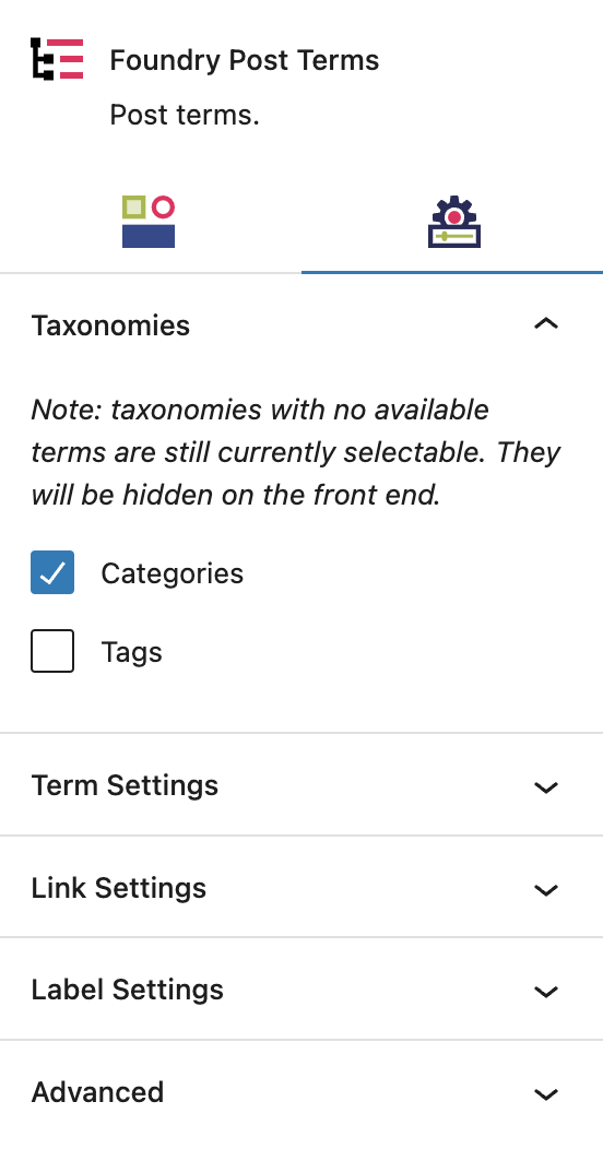 You can customize the Post Terms Block using Style and other settings options, giving you great flexibility in how you tailor elements to your design.