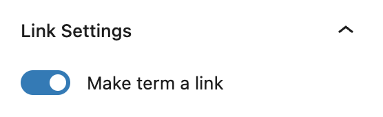 Toggle this setting on or off to make your term a link (which you can customize), or unlinked. For example, if you want people to be able to click the category name and visit a filtered view of posts matching that category, you would link it. But there are UX reasons to show categories or tags and not link them.