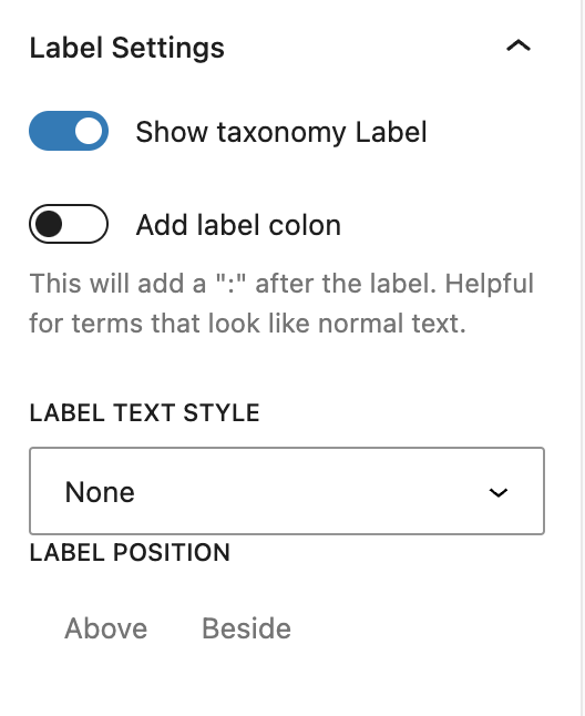 Toggle this option on or off to show or hide your taxonomy label where the post is displayed. When this is toggled on, the following options are revealed: