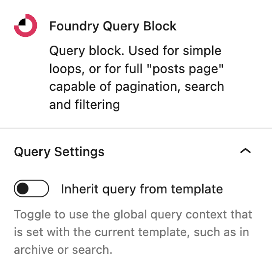 Toggle this setting to set the block to automatically detect and inherit the query context associated with post template, such as an archive or search results. This means if the post template is configured for Blog posts and Design category, the Query Block will automatically display only blog posts in the design category.