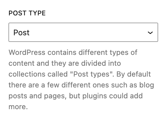 This option lets you choose what type of post content the query should pull. Pages are not able to be queried. The dropdown options will depend on the content that exists in your WordPress site as a post type – there may be several options, or only one.