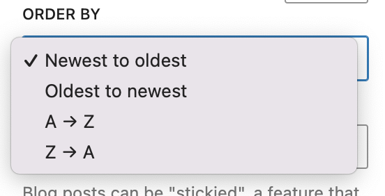 Use this dropdown to set how the Query Block displays content: newest to oldest, oldest to newest, A to Z, or Z to A.
