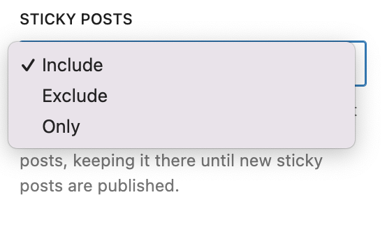 Blog posts can be “sticky”, a feature that pins them to the first position on the landing page even when new content is published. Select from the dropdown if you would like Sticky Posts included, excluded, or to be the only content queried.