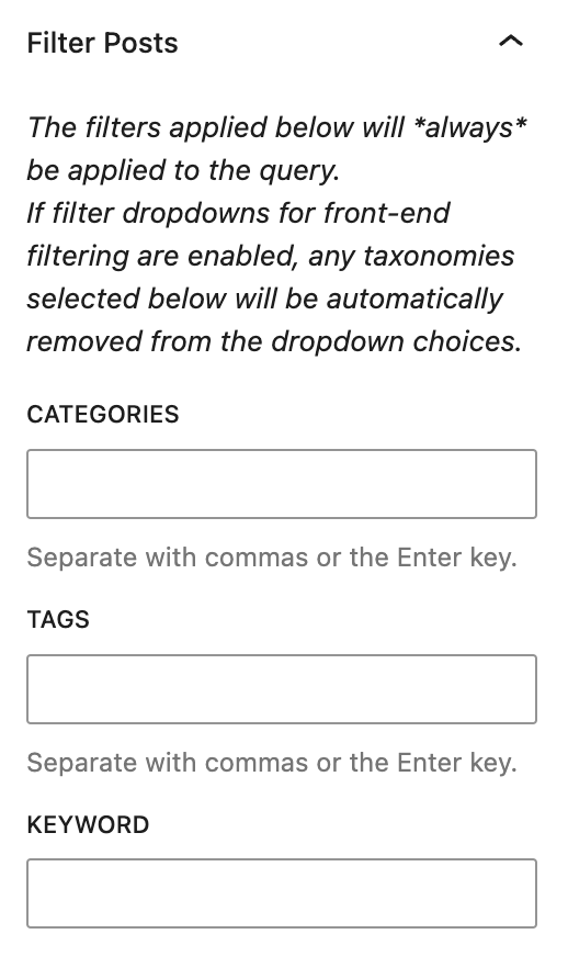 Use this setting to filter posts by categories or keywords. This will automatically filter the frontend display to show only content that matches this parameter from being pulled into your Query Block.