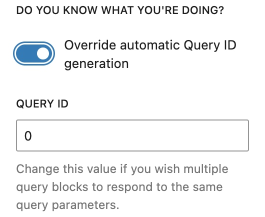 If enabled, this toggle would override the automatic query ID, which is how the Query Block interprets parameters.
