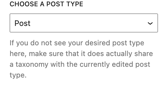 If the Post type selected is the same as the post you’re on, ie. ‘Post’ is selected and you’re editing a Blog post, then any matching terms within taxonomies assigned to the Blog post type will be displayed.