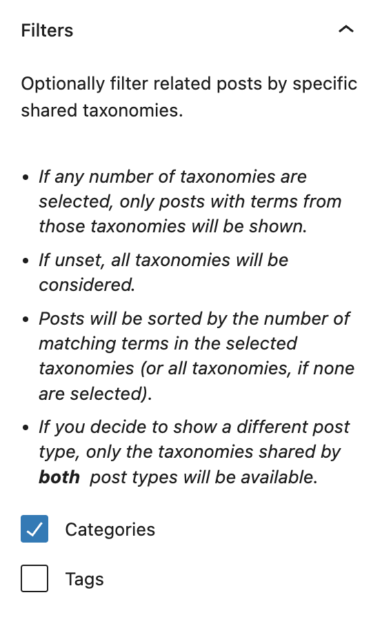 Use this setting to adjust the Related Posts block to only match certain taxonomies if the post it’s located on having multiple taxonomies, such as category and tag. This will automatically filter the frontend display to show only content that matches this parameter from being pulled into your Query Block.