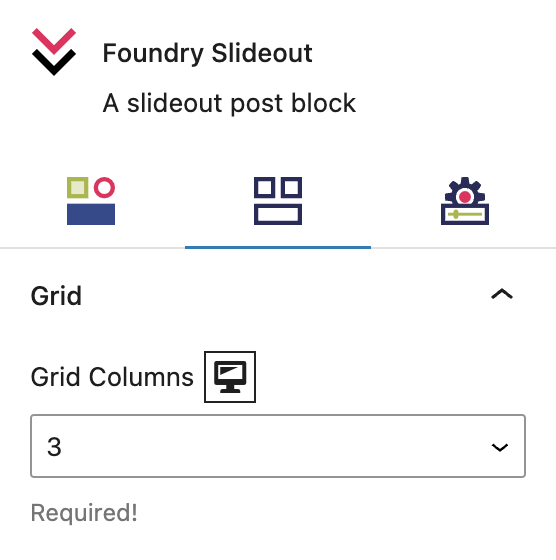 These settings let you choose how many Slideout Block Items will appear left to right in the parent grid. This setting is required for the Slideout Block to work properly.