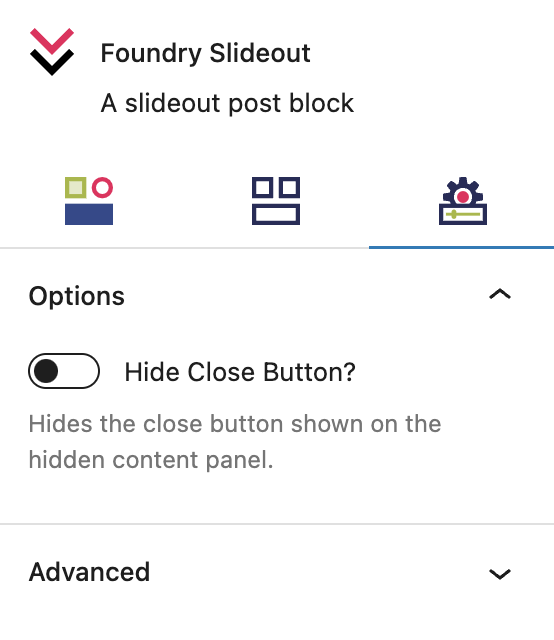 The Slideout Block is also a parent block. You can control how many Slideout Item Blocks appear in your Slideout Block using the settings. Each child Slideout Item Block supports all other Refoundry blocks, meaning you can create any layout you want within each section that slides out. This allows you to build responsive layouts within each item to support a variety of needs for nested content.