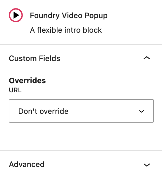 This allows you to replace the need to set a link in the Toolbar with a URL set in a custom field, within a post. This override will display a video popup within a Query Block setup.